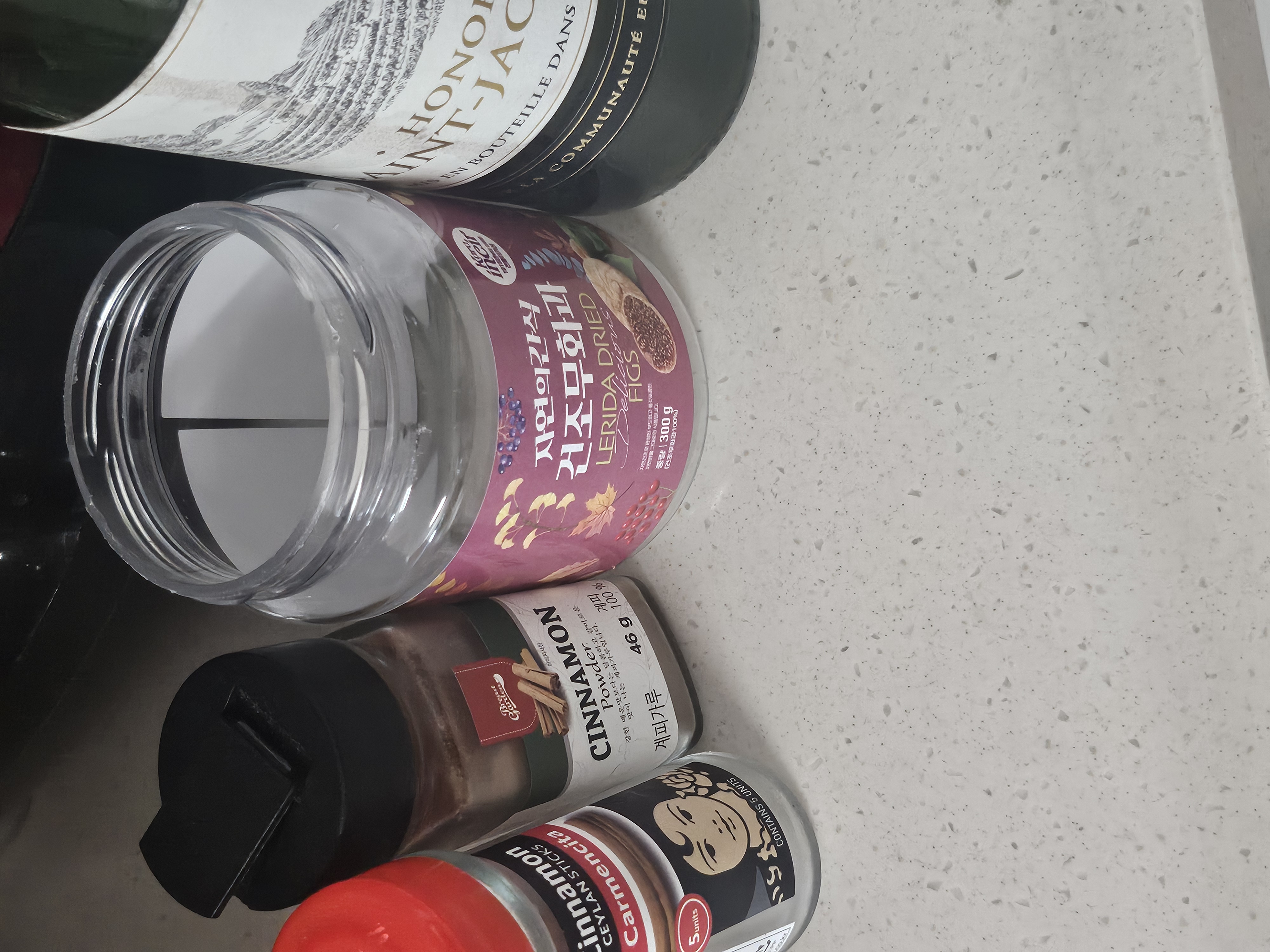 레드와인 400ml, 설탕 50g, 건조 무화과 300g, 계피가루 톡톡, 계피스틱 2개, 레몬즙과 정향, 럼 등은 없어서 생략!