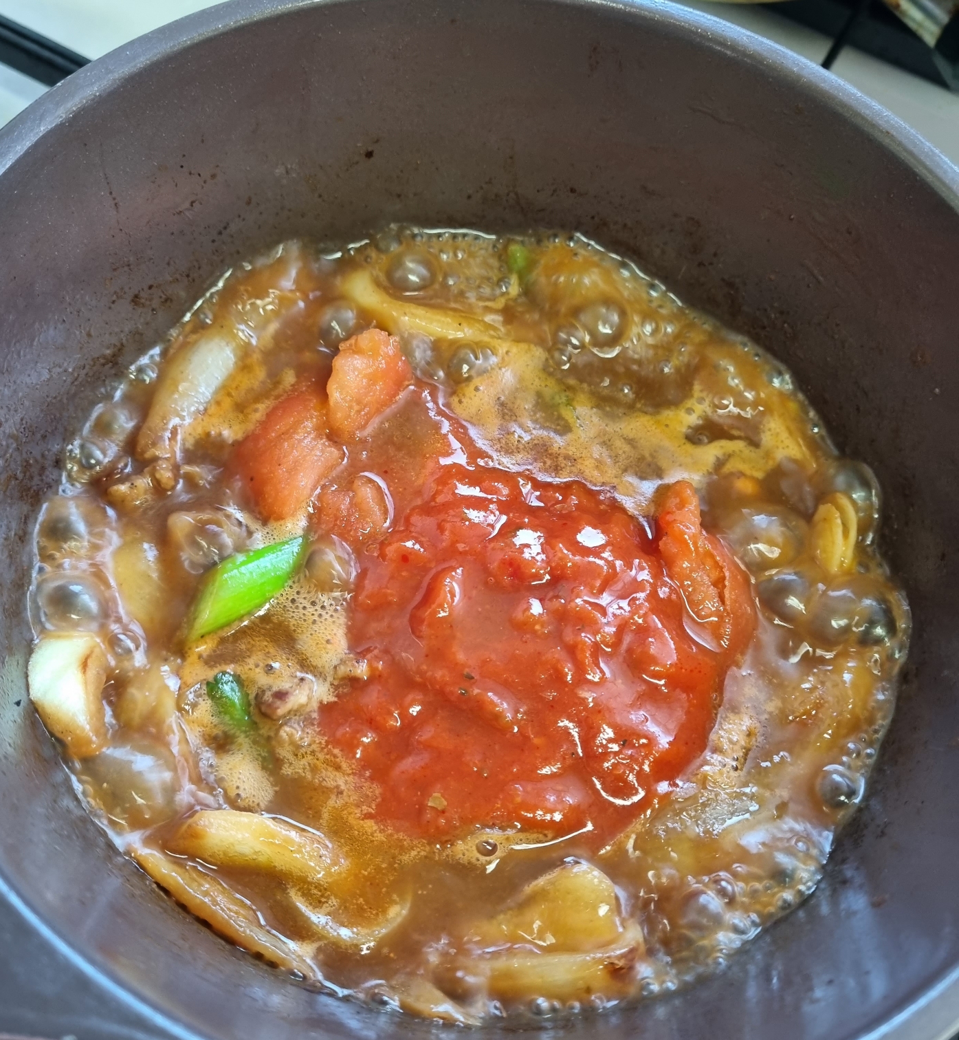 토마토를 넣어주면서 타지 않도록 물을 살짝 넣어주었다.카레와 토마토소스를 넣어준다.