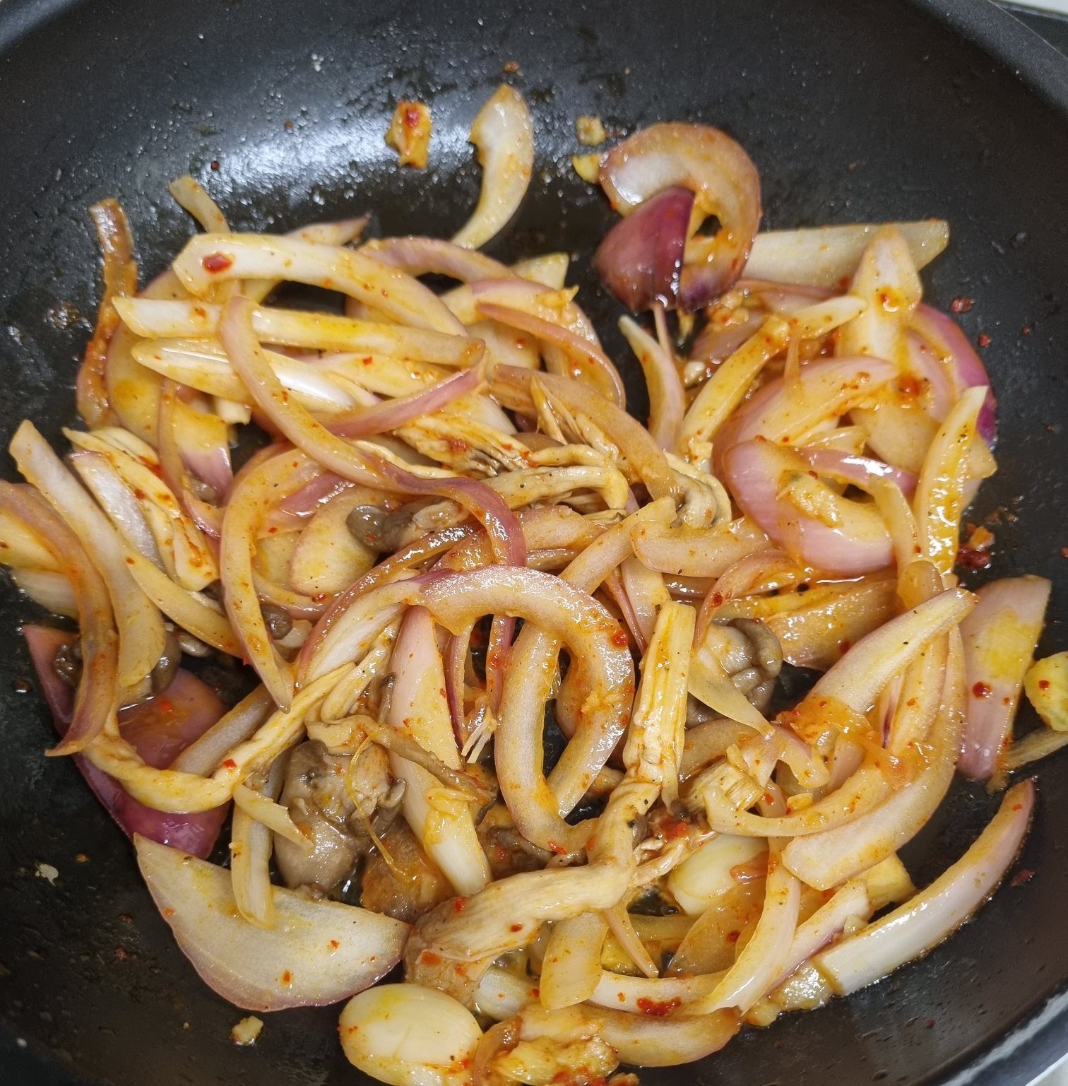 넣어서 볶아준다.고춧가루를 반 스푼 정도 넣어서 색이 변하도록.