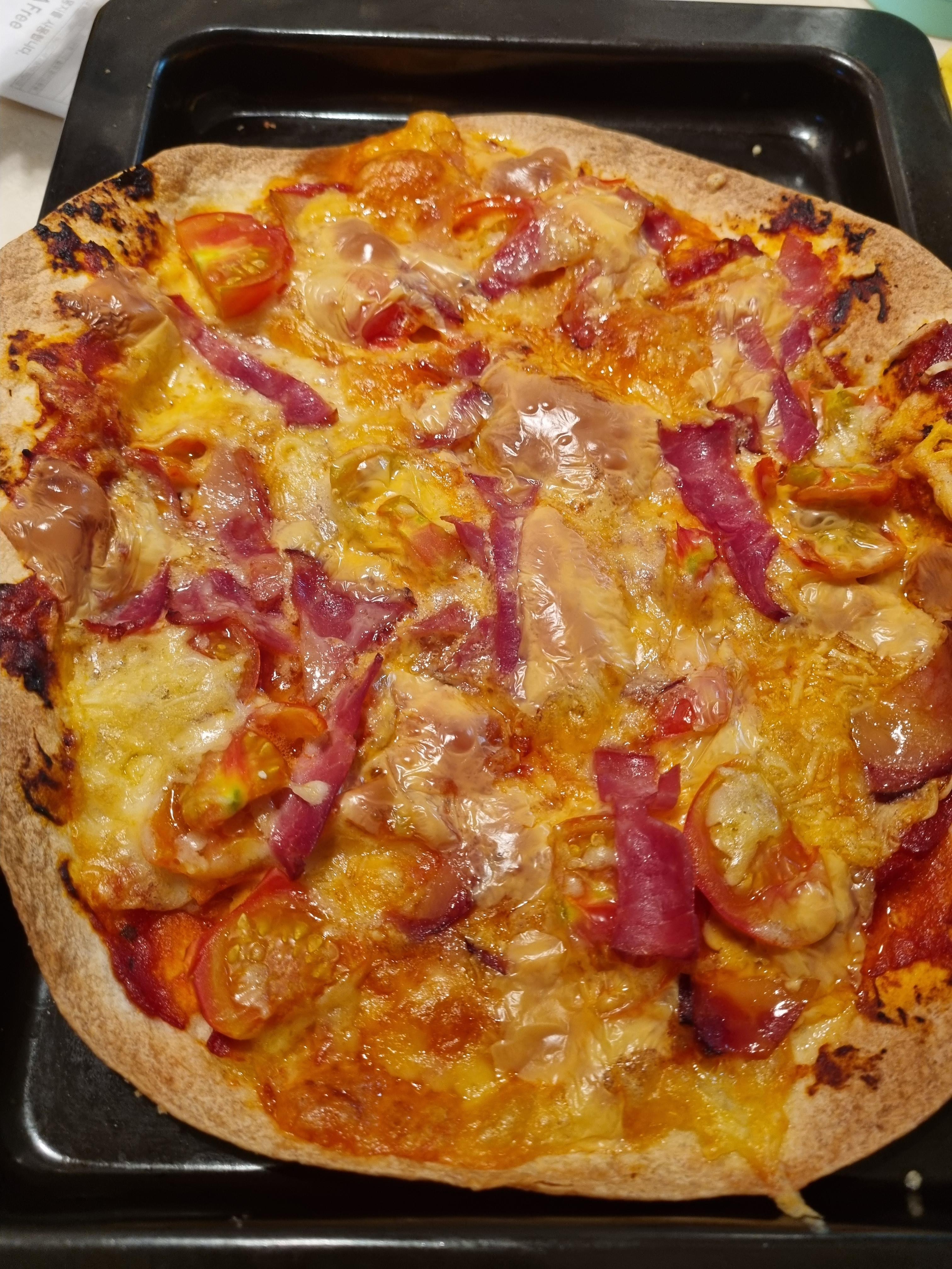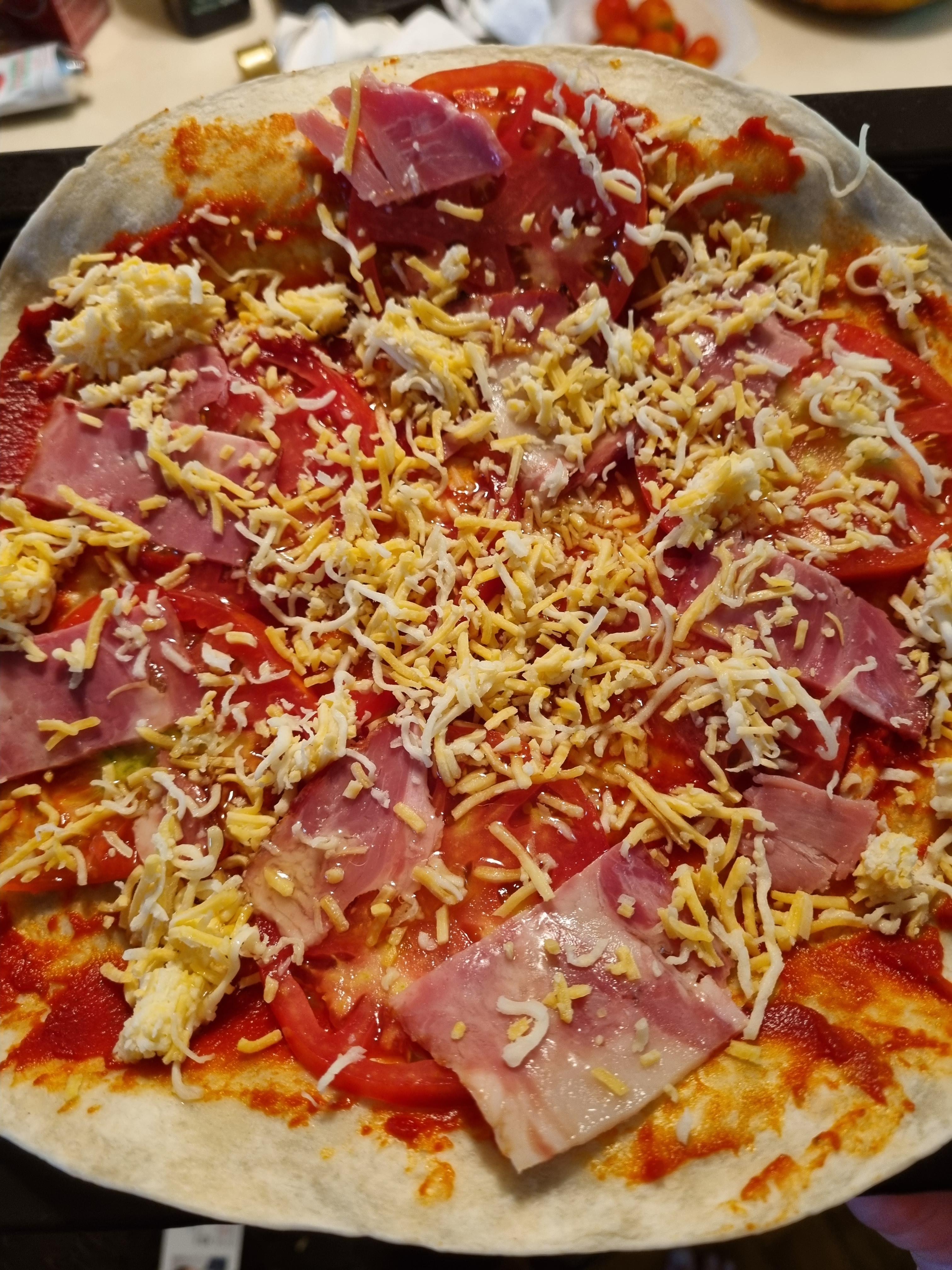 1. 또띠아 두장을 겹쳐서 도우로 한다.(사이에 토마토소스 바름)