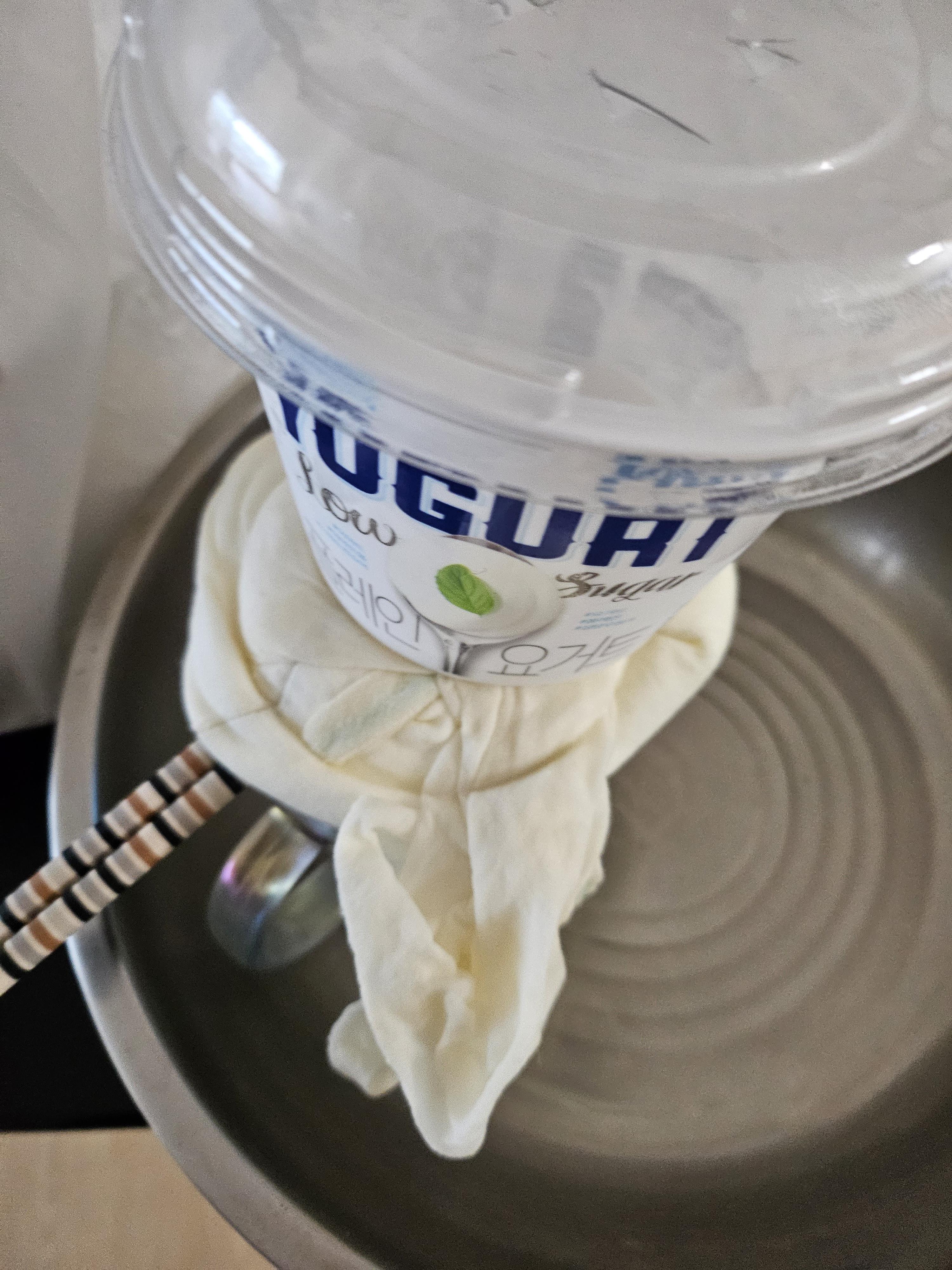 올려놓고 다음 날 확인하니 아래쪽은 단단해 졌지만 삐져나온 사이드는 너무 말랑한 것. 손으로 짜면 요거트만 자꾸 나오고 우리집에서 제일 비싼 냉장고에 유청은 계속 흘러 나를 속상하게 만들었다. ㄱ-