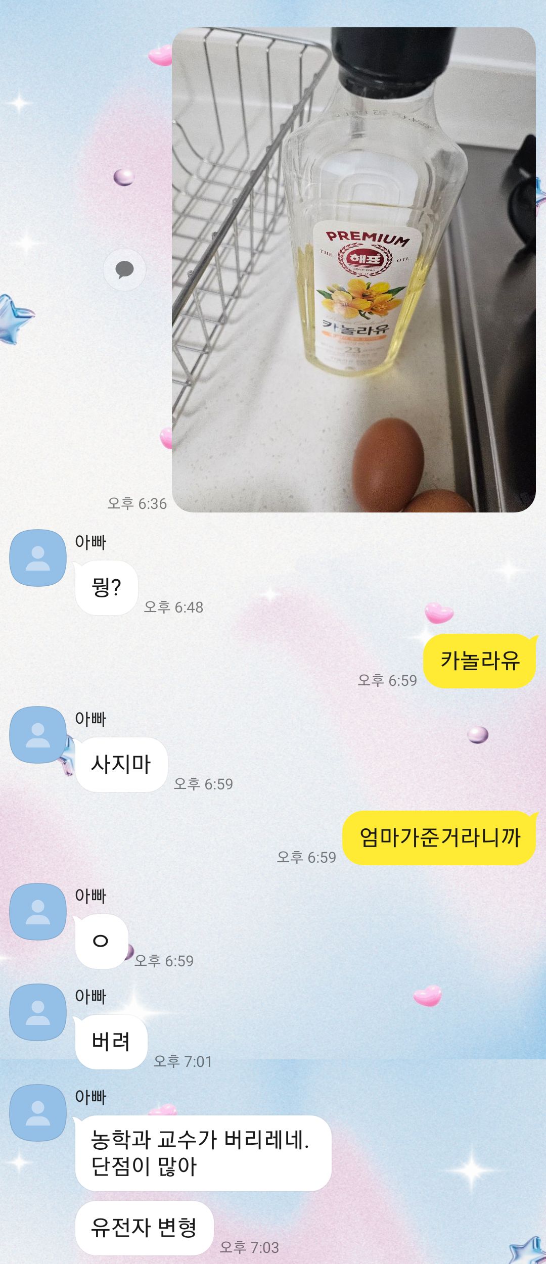 빵은 탔지만 먹는건 나임. ㄱㅊ아빠가 며칠전에 인생에서 꼭 먹으면 안될게 카놀라유라고 집에 있으면 버리라고 엄마한테 말하는걸 들었음. 근데 없길래 우린 안먹구나 했는데 엄마가 준 식용유가 카놀라유였음. ㄱ-