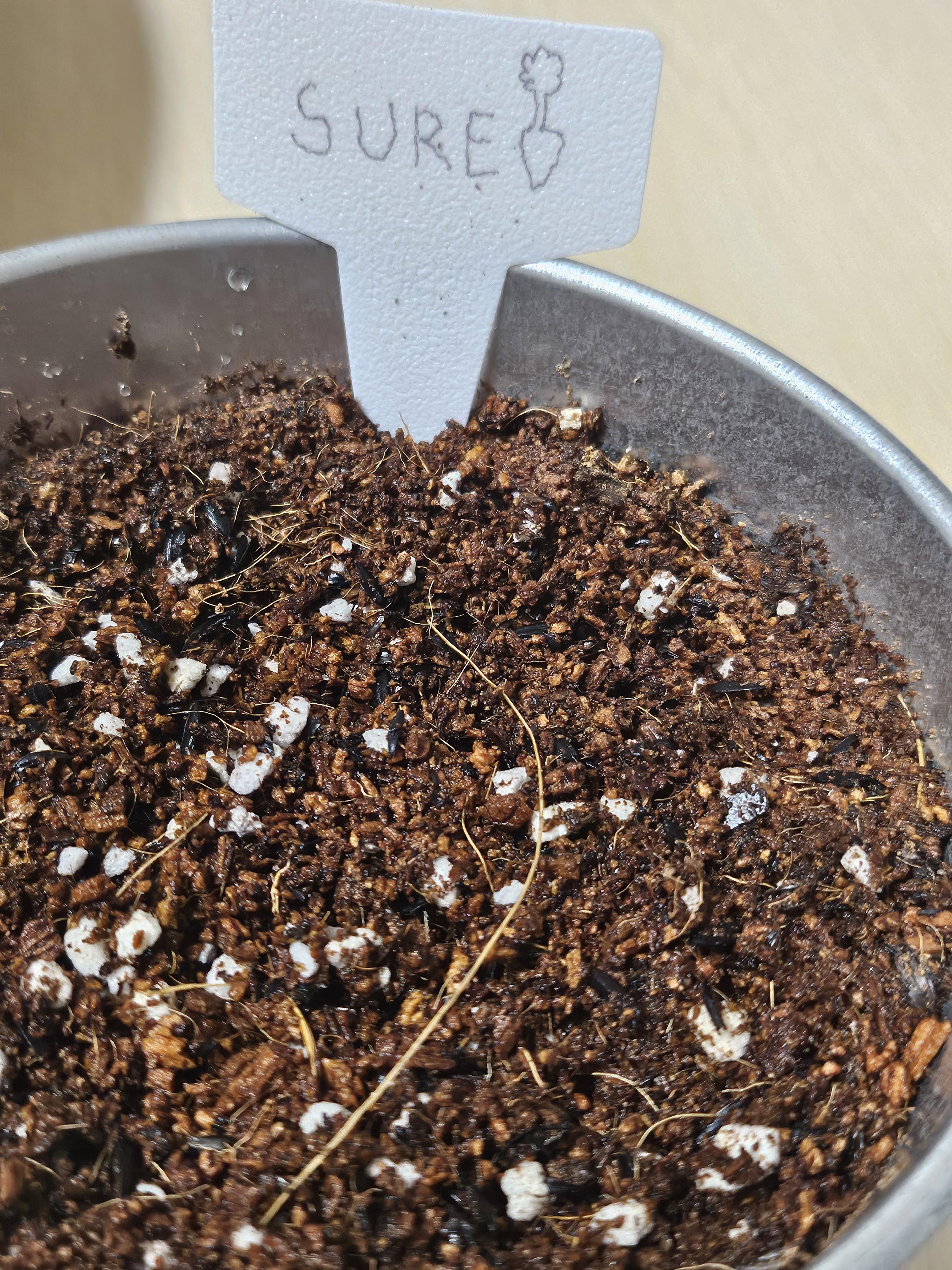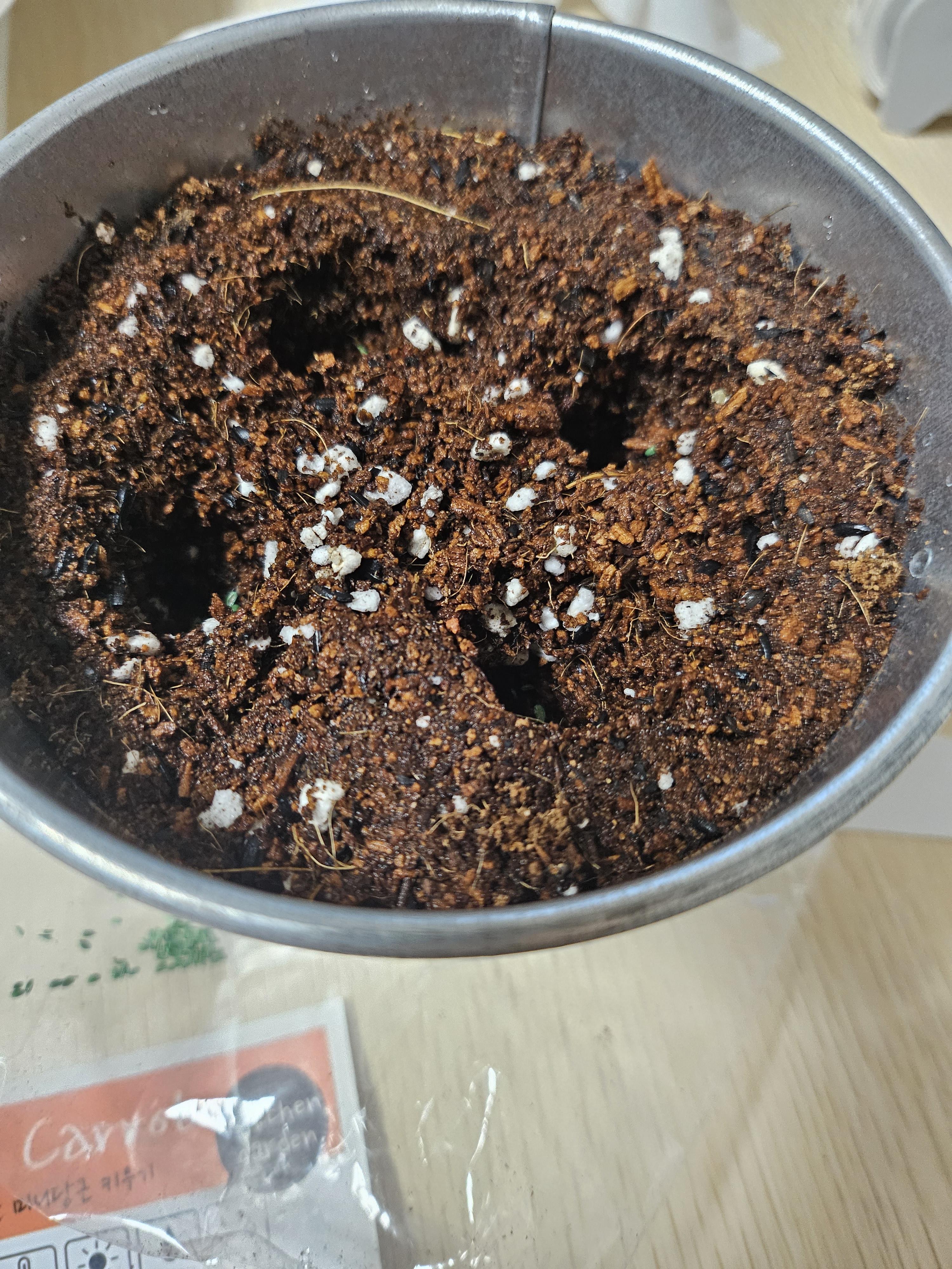 2~3cm 간격으로 0.5cm 깊이의 간격에 씨앗을 넣습니다.
